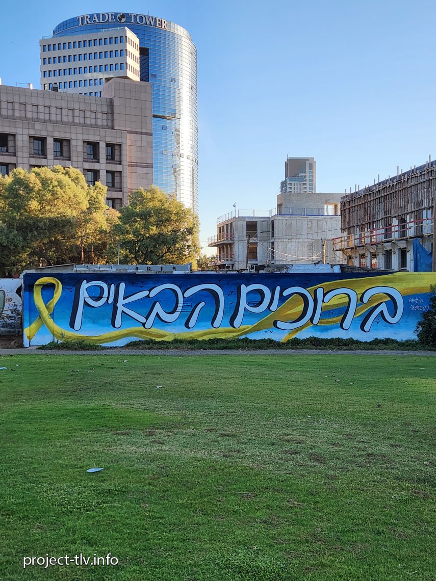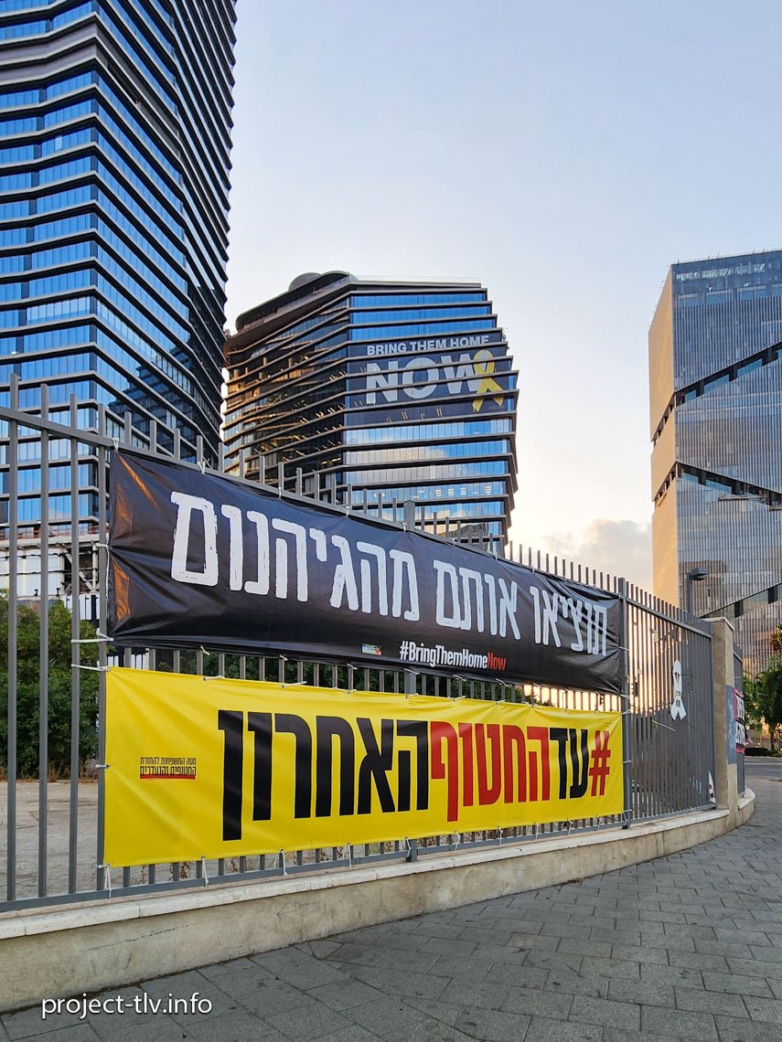 המאמץ הציבורי להשבת החטופים מקבל ביטוי סביבתי בולט ונוגע ללב ברחבי תל אביב, כחלק בלתי נפרד מהנוף העירוני מאז אירועי השבעה באוקטובר. יצירות גרפיטי הנושאים את הקריאה הברורה והדחופה "BRING THEM HOME NOW" מופיעות על קירות ומבנים שונים, כזעקה ויזואלית שמטרתה לשמר את המודעות לנושא ולהפעיל לחץ ציבורי מתמשך. לצד כתובות אלו, פזורים ברחבי העיר, ובפרט בכיכר החטופים שהפכה למרכז המחאה וההזדהות המרכזי, מיצבים אמנותיים ותזכורות ויזואליות שונות. מיצגים אלו יוצרים יחד תזכורת כואבת ומתמדת של האובדן והכמיהה לשובם של החטופים, והופכים את המרחב העירוני לבמה להפגנת סולידריות ודרישה לפעולה.