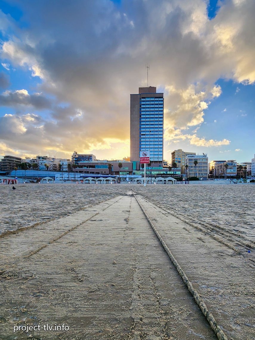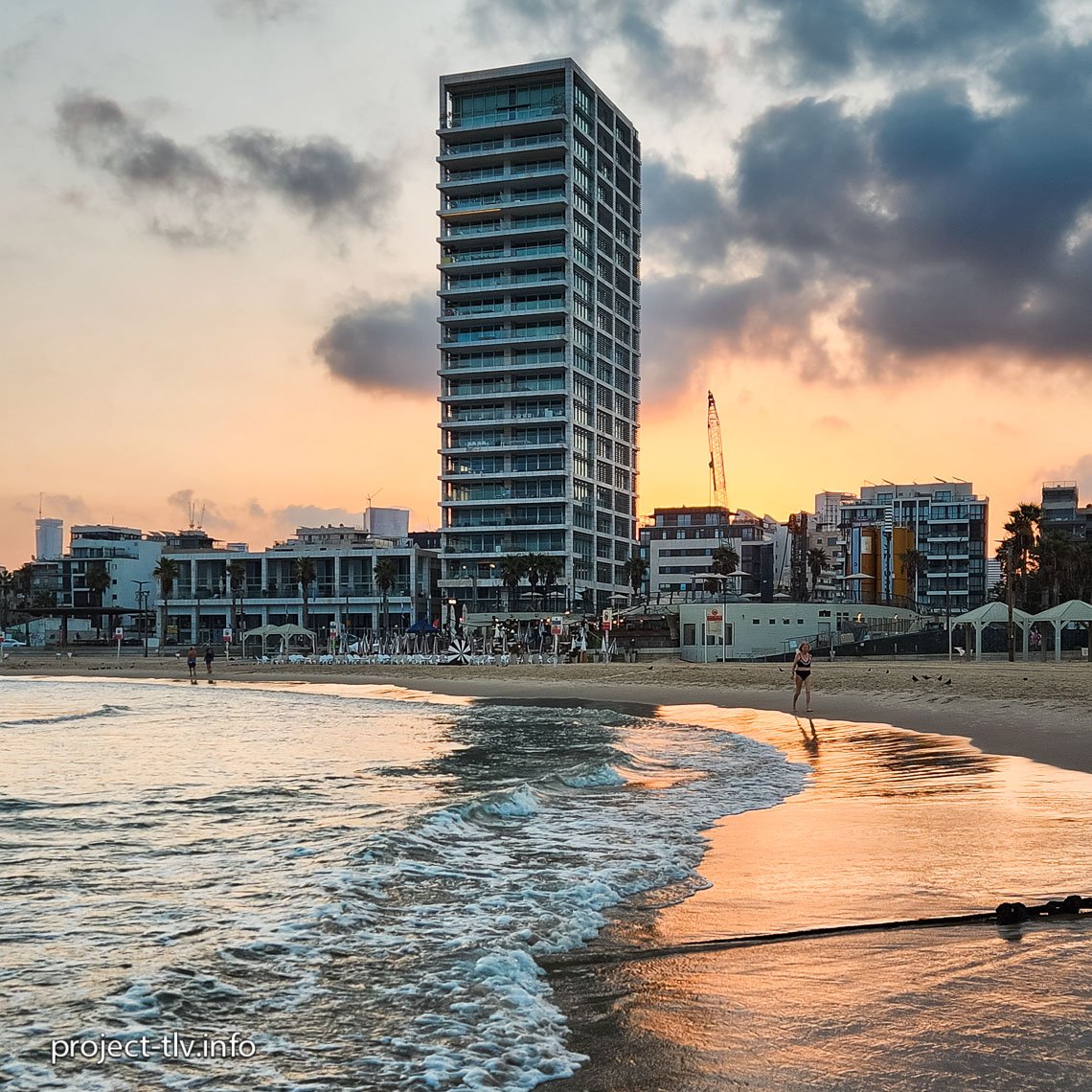 שקיעה בטיילת תל אביב, אזור הדולפינריום וצ'ארלס קלור, פברואר 2024 | ראו גם: שקיעות וזריחות בתל אביב